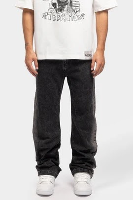 This jeans has a regular fit, part of our Summer '24 collection. The jeans has a unique Black/Grey Wash and zippers on the sides.